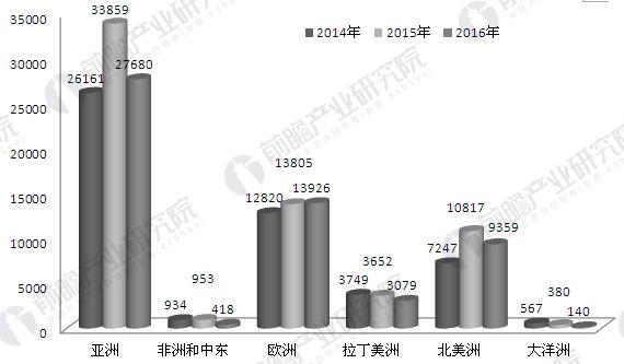 從全球風(fēng)電新增裝機(jī)容量的區(qū)域分布來看,亞洲地區(qū)風(fēng)電新增裝機(jī)容量最多,其次為歐洲地區(qū),北美洲排在第三位。2016年,亞洲地區(qū)風(fēng)電新增裝機(jī)容量為27680MW,歐洲地區(qū)風(fēng)電新增裝機(jī)容量為13926MW,北美洲地區(qū)風(fēng)電新增裝機(jī)容量為9359MW。