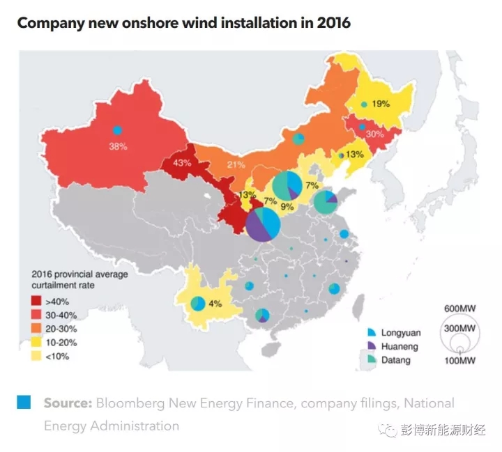 2016年,龍源、華能和大唐三家公司81%的新建容量均位于棄風水平較低的地區