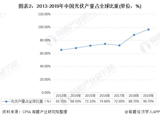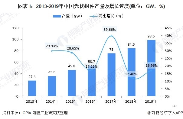我國是光伏產(chǎn)業(yè)大國,擁有全球最完整的產(chǎn)業(yè)鏈。2019年,同期,盡管在政策調(diào)整下,我國光伏應(yīng)用市場有所下滑,但受益于海外市場的增長,中國光伏各環(huán)節(jié)產(chǎn)業(yè)規(guī)模依舊保持了快速增長勢頭。2019年,中國光伏組件產(chǎn)量達到了98.6GW,占全球產(chǎn)量比重不斷上升。作為全球最大光伏產(chǎn)品制造國及出口國,中國光伏裝機量、發(fā)電量已連續(xù)多年位列全球首位。