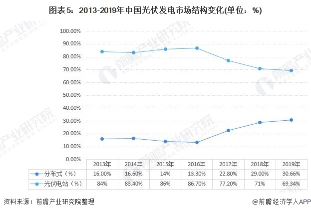 另從行業(yè)結(jié)構(gòu)看,不同于光伏電站,分布式光伏發(fā)電是指在用戶所在場地或附近建設(shè)運行,以用戶側(cè)自發(fā)自用為主、多余電量上網(wǎng)且在配電網(wǎng)系統(tǒng)平衡調(diào)節(jié)為特征的光伏發(fā)電設(shè)施。近年來,國家對分布式光伏發(fā)電系統(tǒng)一直采取積極鼓勵的態(tài)度,并出臺了一系列扶持措施。2016年底出臺的《電力發(fā)展“十三五”規(guī)劃》對分布式光伏設(shè)定了超常規(guī)發(fā)展目標:“2020年,太陽能發(fā)電裝機達到1.1億千瓦以上,分布式光伏6000萬千瓦以上”。隨著各地分布式光伏發(fā)電建設(shè)的推進。我國光伏發(fā)電市場結(jié)構(gòu)發(fā)生改變,尤其是2016年以來,我國分布式光伏市場份額已經(jīng)由13.3%提升至2019年的30.33%。