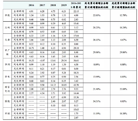 九大電力央企集團2016-2019風電和光伏新增裝機情況(GW,%)