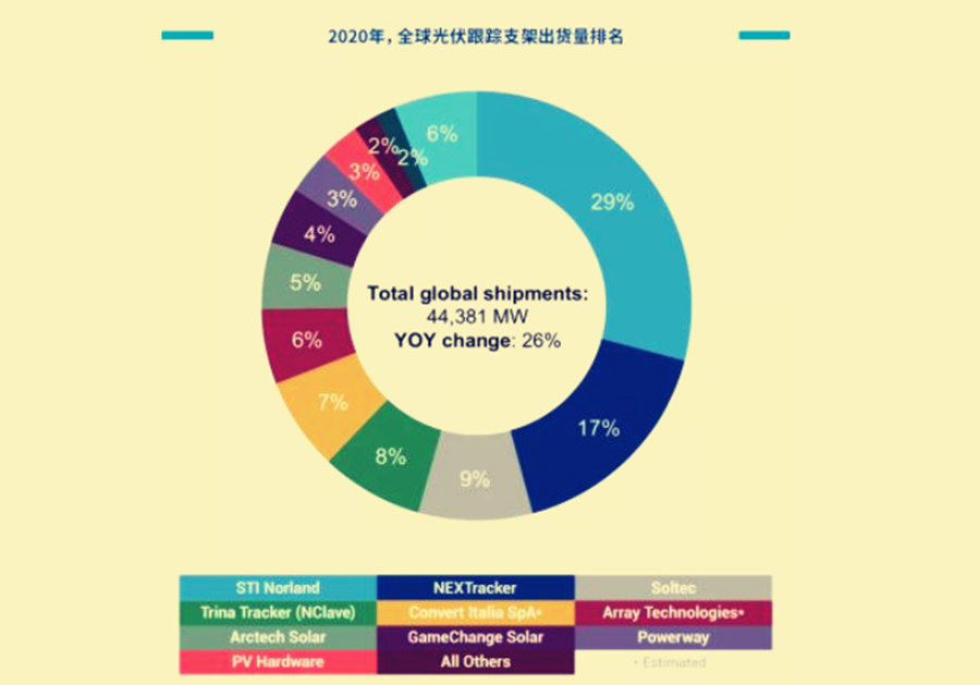 據伍德麥肯茲最新研究統計數據,盡管受到2020年新冠疫情影響,全球光伏追蹤支架出貨量仍增至44GW,同比增長26%。NEXTracker蟬聯榜首,Array Technologies與PV Hardware緊隨其后。