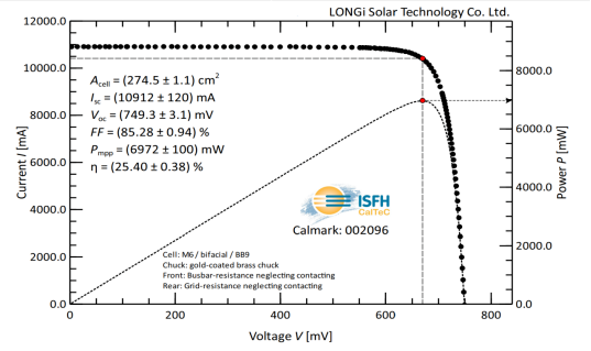 3月29日,經德國哈梅林太陽能研究所(ISFH)認證,隆基采用摻鎵p型硅片制備的硅異質結電池(p-HJT)獲得效率新突破:完全利用可量產工藝在全尺寸(M6尺寸,面積274.3cm)單晶硅片上,創造了轉換效率為25.47%的大尺寸p型光伏電池效率世界紀錄,進一步驗證了低成本異質結量產技術的可行性。
