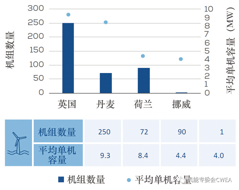圖2 2021年歐洲各國新安裝海上風電機組的數量與平均單機容量