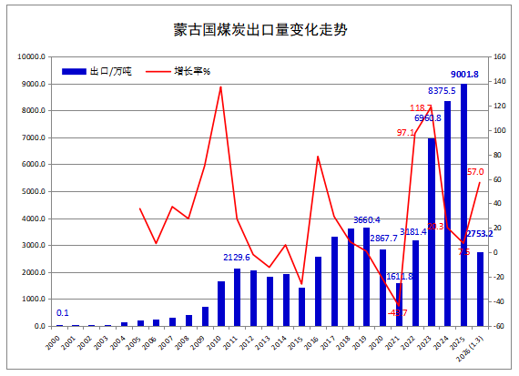 2026年一季度蒙古國煤炭出口同比增長57.0%