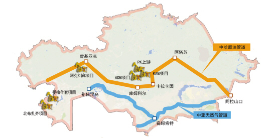 全長2830公里的中哈原油管道,經阿拉山口直接通往中國的煉油廠。起自土庫曼斯坦、全長1794公里的中亞天然氣管道,在哈薩克斯坦境內約1300公里,經南部的江布爾州,穿越阿拉山口將“藍金”送到中國的千家萬戶。而中國石油在與哈薩克斯坦的能源合作中,截至2012年底,累計上繳稅費230多億美元,公益事業(yè)支出2.5億美元以上,提供就業(yè)崗位2.8萬多個。