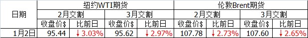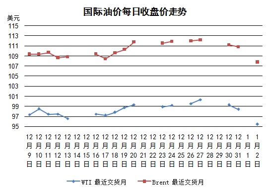 1月2日國際石油期貨價(jià)格大跌。美元當(dāng)日對(duì)歐元走強(qiáng),以美元定價(jià)的原油價(jià)格給人以較高的感覺,促使油價(jià)下行。另外,中國國家統(tǒng)計(jì)局公布的12月PMI數(shù)據(jù)低于前一月,這也利空油價(jià)。美國經(jīng)濟(jì)數(shù)據(jù)空多交織,首次申請(qǐng)失業(yè)保險(xiǎn)人數(shù)比前一周小幅改善,減少2000人至33.9萬人,但美國供給管理協(xié)會(huì)公布的12月美國制造業(yè)PMI為57.0,低于前一月的57.3。