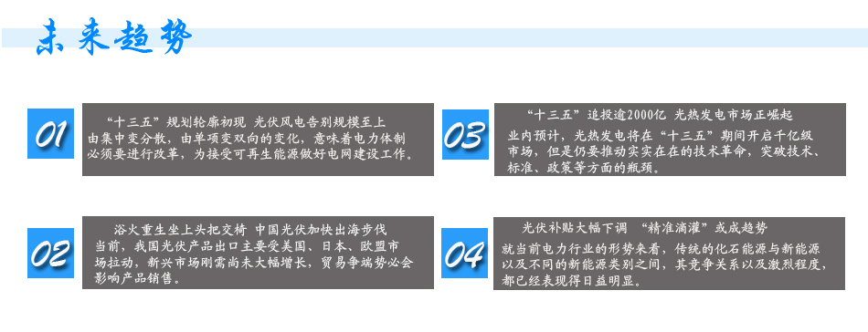 近期有媒體稱,由相關政府部門規劃,2017年將推出領跑者升級版——“超級領跑者”光伏前沿技術示范基地,該基地將對已具備大規模量產能力但產能尚未釋放的先進技術進行重點扶持,每個基地規模高達GW級別。 [詳細]